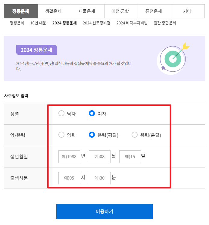 - 정통운세 페이지에서 평생운세, 10년 대운 등 보고 싶은 운세를 클릭하고 생년월일 정보를 넣으면 됩니다.